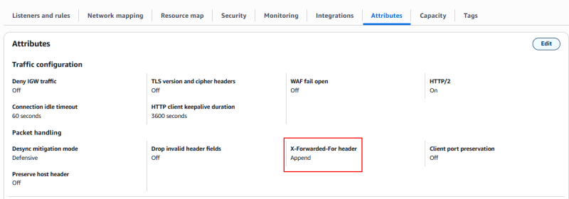 1. Append (default): If the value is append, the Application Load Balancer adds the client IP address (of the last hop) to the X-Forwarded-For header in the HTTP request before it sends it to targets. 1. Preserve: If the value is preserve, the Application Load Balancer preserves the X-Forwarded-For header in the HTTP request, and sends it to targets without any change. 1. Remove: If the value is remove, the Application Load Balancer removes the X-Forwarded-For header in the HTTP request before it sends it to targets.